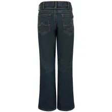This stretch denim jean fits like your weekend jeans and moves with you while you work. Features five jean-style pockets and bootcut leg openings. These flame-resistant jeans feature a soft pre-wash and sanded fabric for a modern look, while providing CAT2 protection and NFPA® 2112 compliance. It has a one-piece waistband with metal button closure. The metal button is not exposed to your skin. Certifications Level 1: ASTM F1506, NFPA 2112, NFPA 70E.