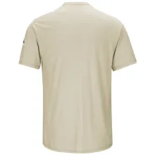 Khaki three-button placket › Dyed to match rib knit henley collar › Raglan sleeves › Dyed to match rib knit cuffs › Chest pocket › Fabric is moisture wicking and breathable › Bulwark reseller hang tag